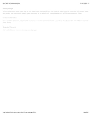 Heavenly Scenic Gondola Ride 2022 - Lake Tahoe A 2.4 mile ride up in the Heavenly Mountain Gondola will leave you breathless as you take in panoramic views of Lake Tahoe. On your way up, stop at the Observation Deck for photos, a latte at Cafe Blue or a unique Heavenly souvenir at The Gondola Sports shop.